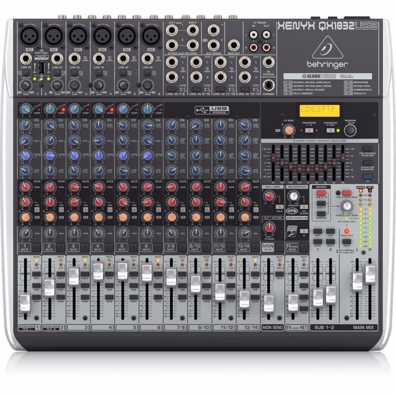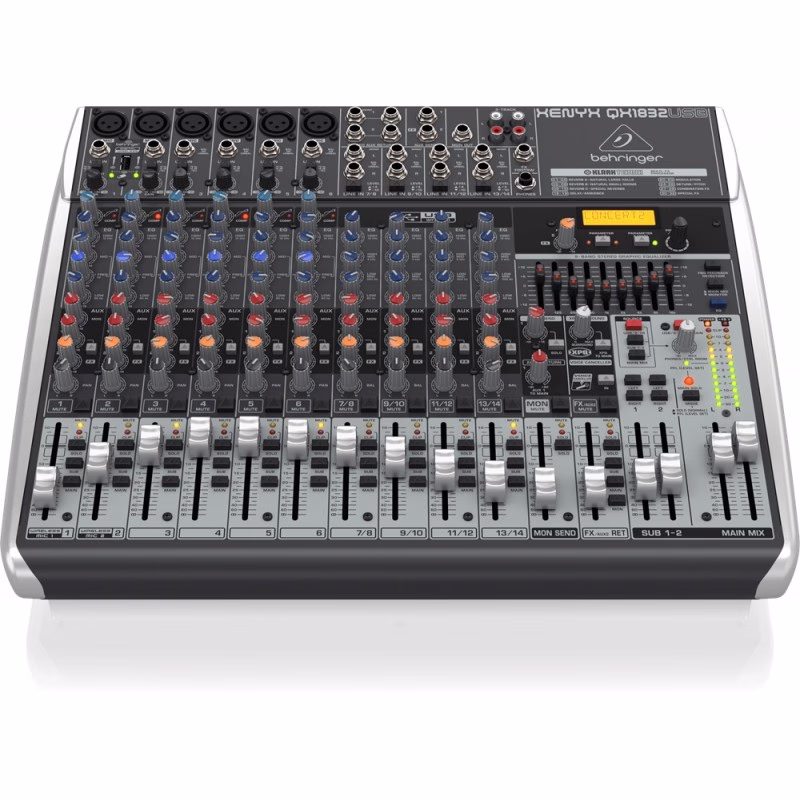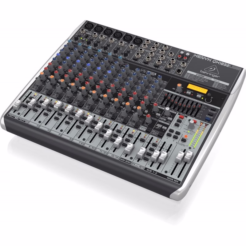 El Behringer Xenyx QX1832USB es un mezclador analógico versátil y potente, ideal para estudios, presentaciones en vivo y producciones multimedia. Ofrece preamplificadores de micrófono Xenyx de alta calidad, compresores integrados, efectos digitales Klark Teknik y conectividad USB para integración directa con computadora.