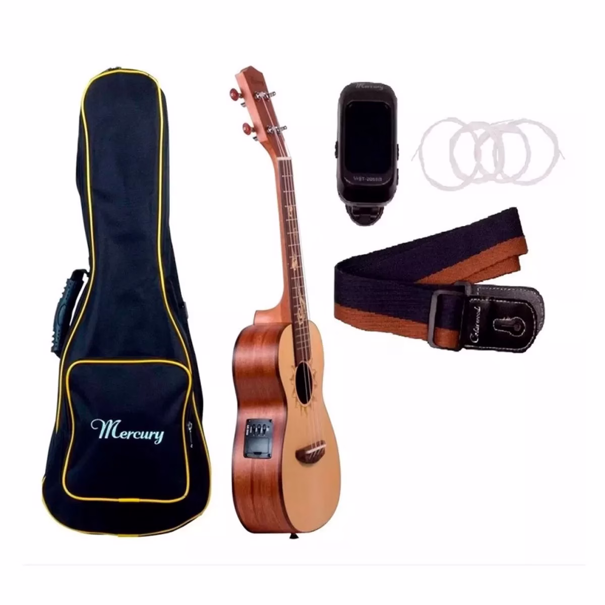 onjunto de ukelele electroacústico para concierto Mercury 14setmuke04. Este ukelele, de tamaño concierto, cuenta con una tapa de pino abeto, fondo y costados de sapelly, cuerdas Aquila y un ecualizador con control de volumen, agudos y graves. Incluye una funda acolchada, afinador de pinza, colgador y un juego adicional de cuerdas.