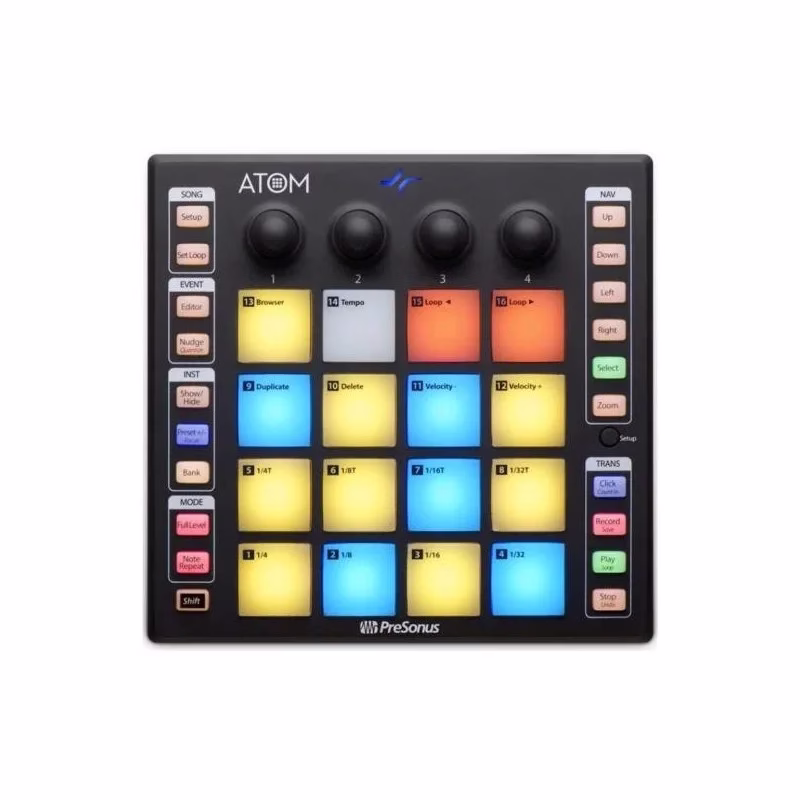 - Integración con Software: Además de ser compatible con Studio One, el Atom ofrece una integración estrecha con Ableton Live, lo que facilita la producción, ejecución de instrumentos virtuales y activación de samples y bucles con una expresividad sin igual.